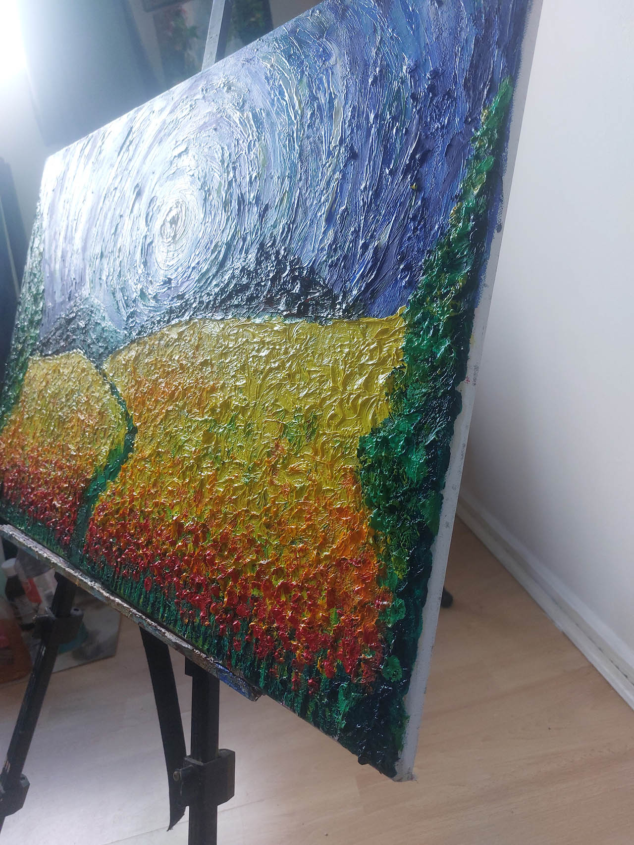 A bright summers view. Done in thick, textured oils it will enliven a smaller space.
